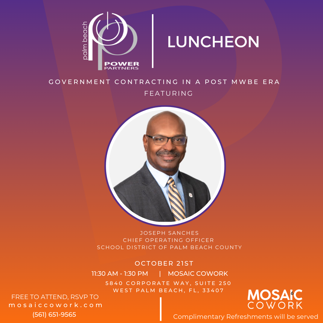 Mosaic CoWork at 5840 Corporate Way Suite 250, West Palm Beach, FL, United StatesRegister Now Looking to gain the edge with new business opportunities? Look no further than the Palm Beach Power Partners Power Luncheon series! We'll be featuring a dynamic speaker who will share insider tips and strategies for success. Whether you’re a new or seasoned business owner, join us and network with fellow professionals, meet potential […]